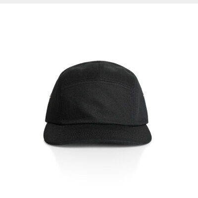 Low profile five panel cap, mesh side panels, adjustable plastic fastener, metal side eyelets, flat peak